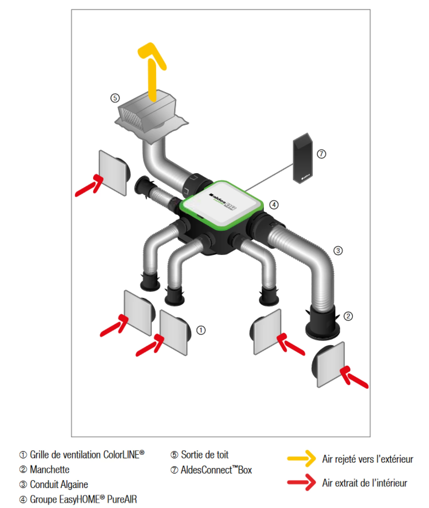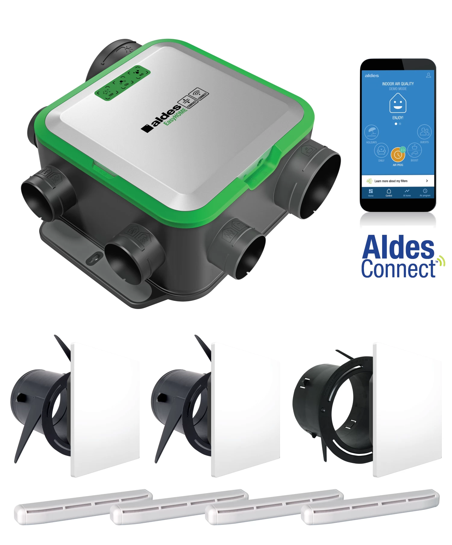 Sistem de ventilatie centralizata ( extractie ) cu control prin internet IOS/ANDROID AldesConnect, pachetul include centrala de ventilatie PureAir Compact Premium, 3 grile de extractie ColorLine culoarea alba cu posibilitate de inlocuire ulterioara a capacului grilei cu alte 15 culori si 4 grile AirFilter de perete pentru introducere aer cu filtru polen, co2, cov, umiditate, necesita suplimentar tubulatura, grilele de introducere aer dirijeaza aerul catre tavan si se monteaza pe perete in incaperi precum dormitoare, birouri, living iar grilele de extractie conectate la centrala de ventilatie extrag aerul viciat din bucatarie, baie, camara.